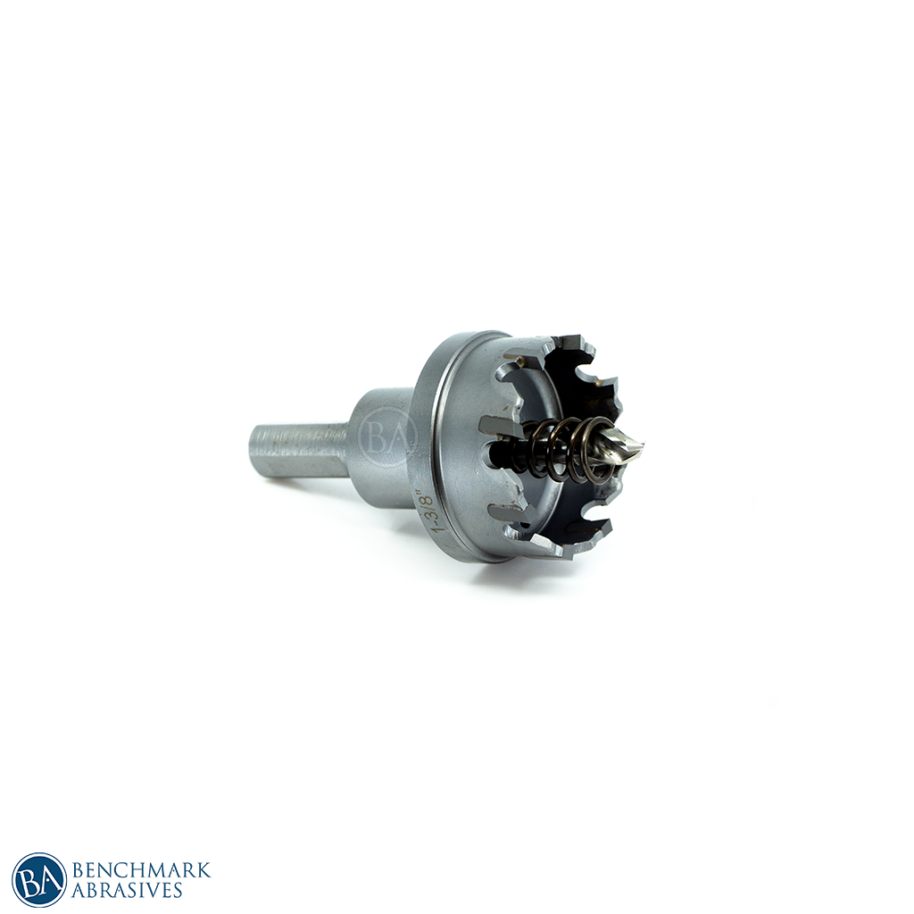Benchmark Abrasives 1-3/8" Tungsten Carbide Tipped Hole Cutters are ideal for drilling steel plate, stainless steel, iron, aluminum, copper, cast iron, fiberglass, and plastic up to 1 inch thick. It has a tremendous edge-cutting system for fast, bur-free/smooth drilling. This tungsten carbide-tipped hole cutter is a perfect portable tool for the professional electrician, plumber, mechanic to drill large diameter holes in hard materials using an electric drill. Includes hole cutter, hex key, and pilot bit.