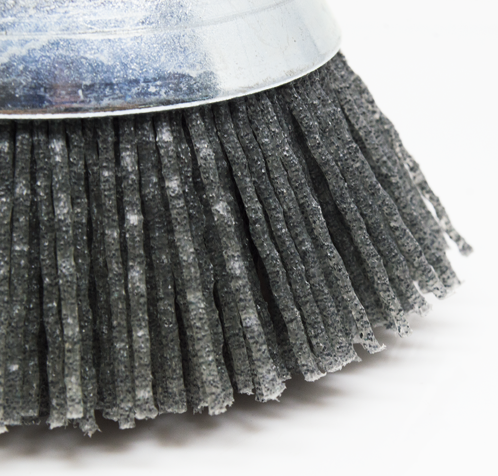 2-1/2" x 1/4" Mounted Nylon Wire Cup Brush are conveniently color coded (Gray/Orange/Blue).