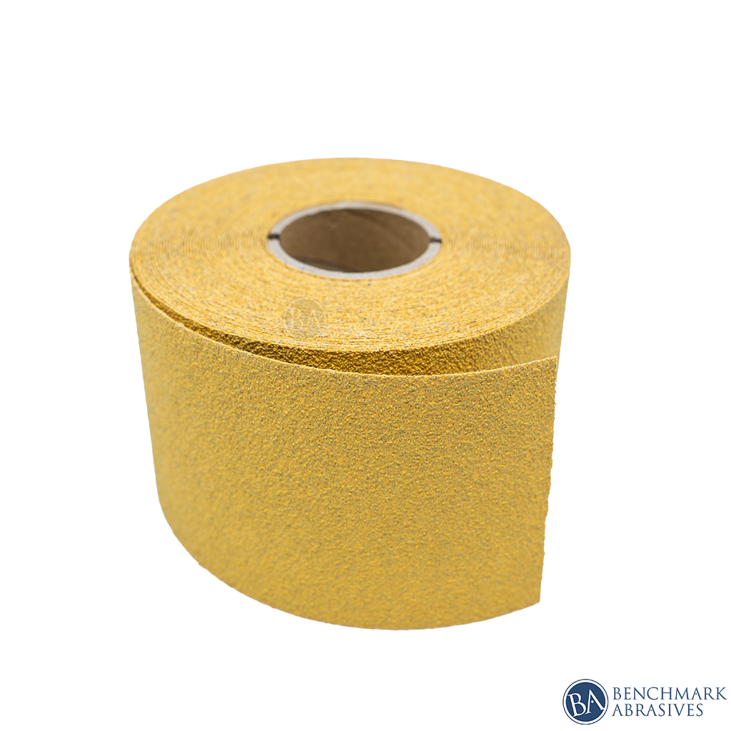 Benchmark Abrasives 2-3/4" x 36’ (12 Yards) Gold PSA Sanding Sheet Rolls offer fast, convenient mounting of sanding discs, rolls, or sheets. Available in a variety of backings, these discs make mounting on a disc sander, orbital sander, rotary sander, and other equipment quick and easy.   These rolls are made with premium Gold Aluminum Oxide grains.  Typical applications for gold sanding discs include preparing primed and painted surfaces for finishing, stripping primer and paint, sanding plastic and fiberglass, light weld blending and deburring, bare wood sanding, and finishing metal of all types. This sandpaper roll features a clog-reducing net design coated in premium aluminum oxide grit for fast material removal while reducing material build-up.