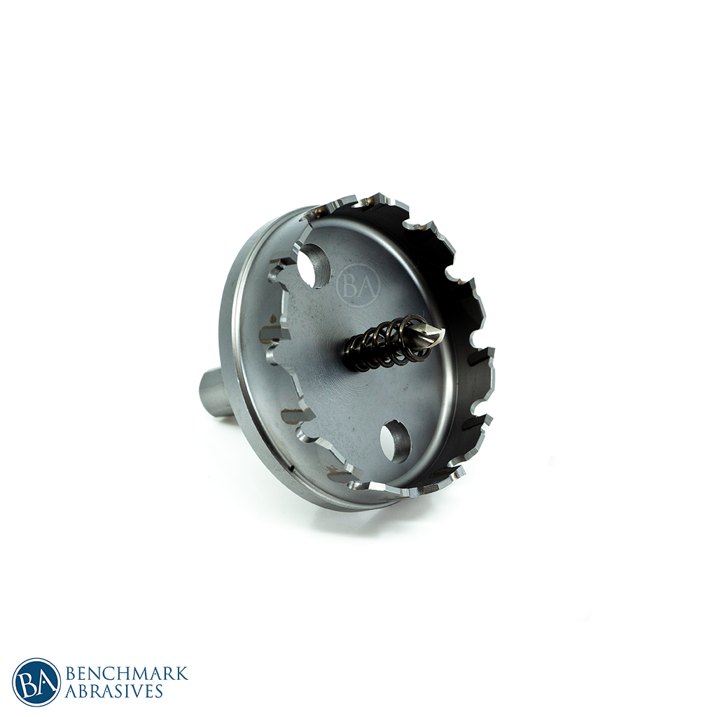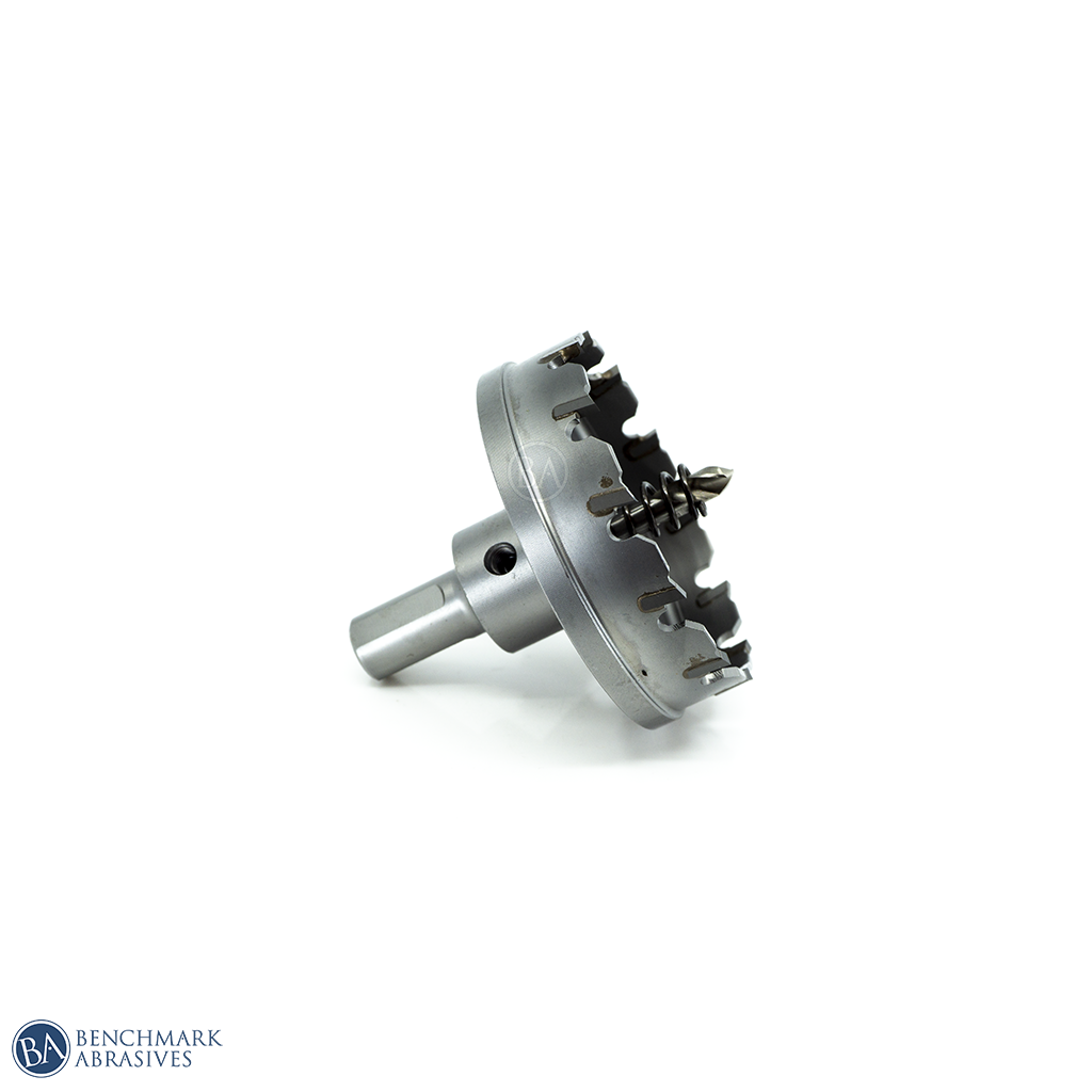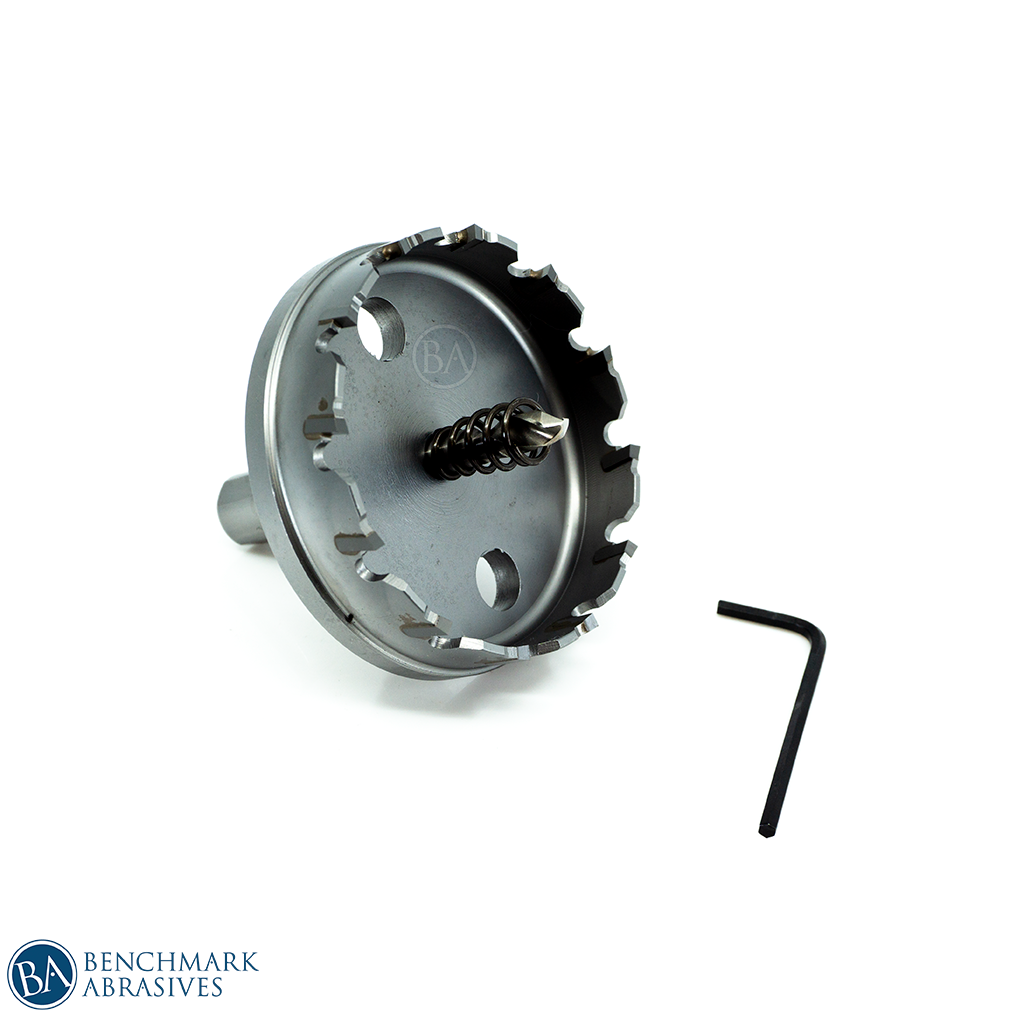 Benchmark Abrasives 2-5/8" Tungsten Carbide Tipped Hole Cutters are ideal for drilling steel plate, stainless steel, iron, aluminum, copper, cast iron, fiberglass, and plastic up to 1 inch thick. It has a tremendous edge-cutting system for fast, bur-free/smooth drilling. This tungsten carbide-tipped hole cutter is a perfect portable tool for the professional electrician, plumber, mechanic to drill large diameter holes in hard materials using an electric drill. Includes hole cutter, hex key, and pilot bit.