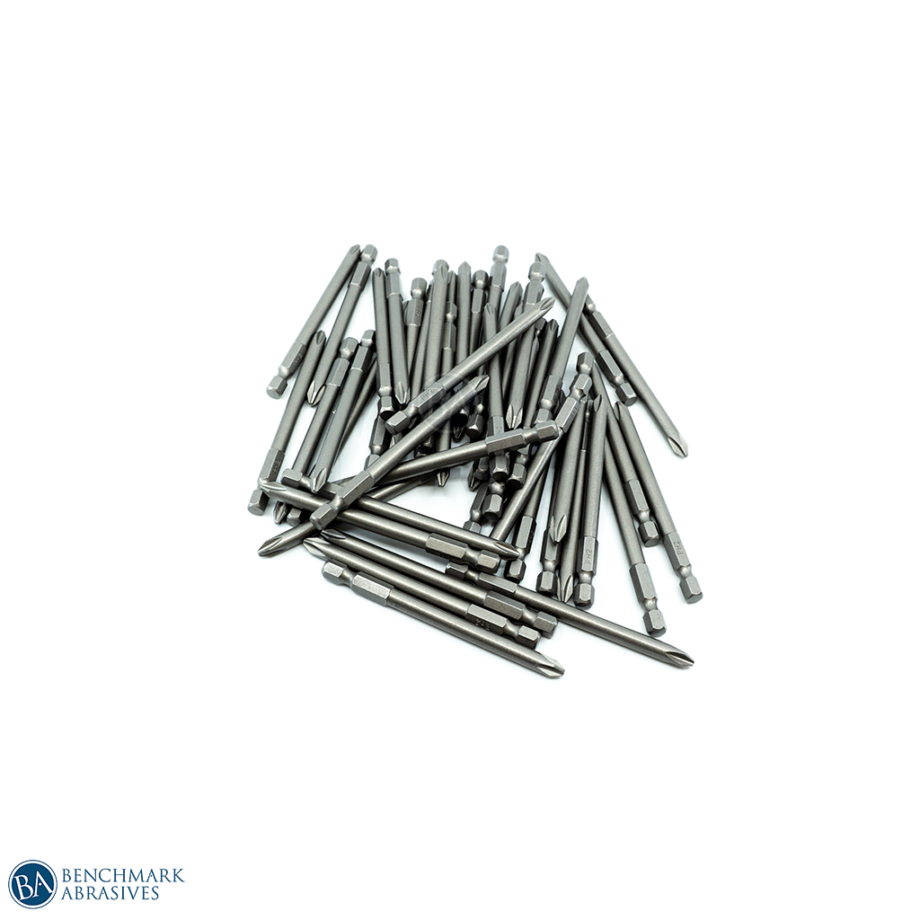 Benchmark Abrasives #2 x 3-1/2" Phillips Power Bit 1/4" hex are CNC machine ground out of heat-treated S2 Shock resistant tool steel, which will withstand extremely high torque output and provide maximum durability. The bits are precision-machined tips for an ideal fit in screw head recesses.