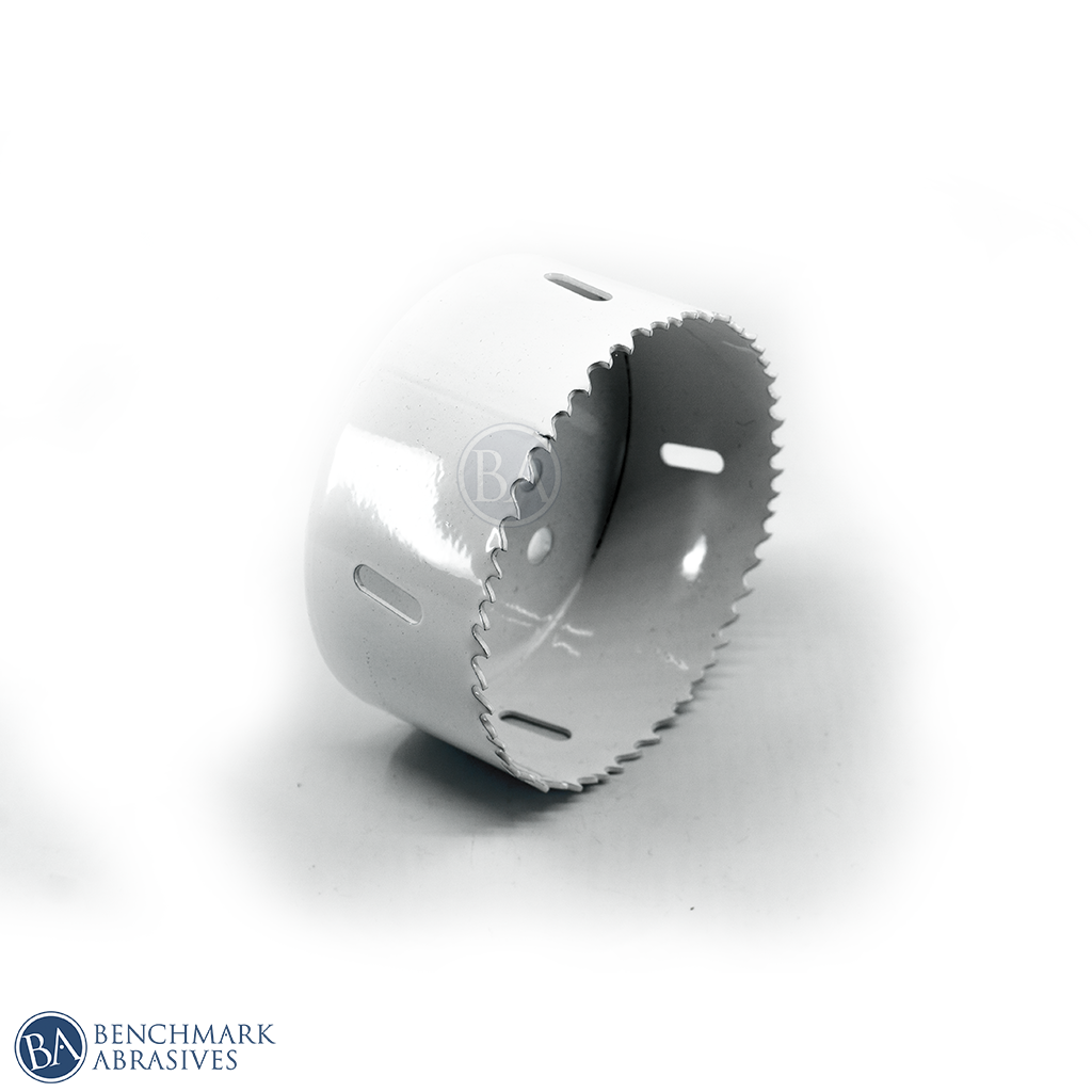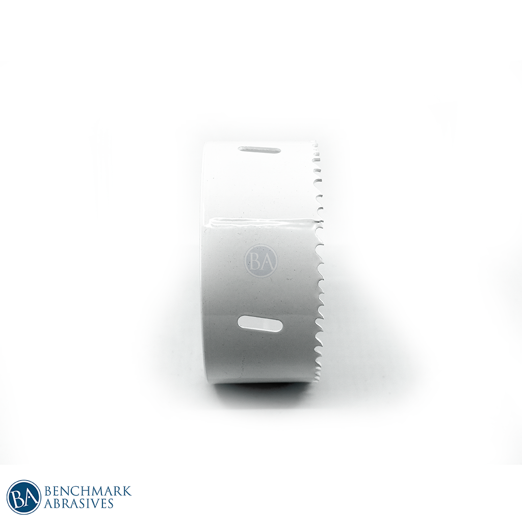 Benchmark Abrasives 3-3/4" Bi-Metal Hole saws are MADE IN USA. Constructed from durable bi-metal for high-performance cutting power, the 4/6 TPI (teeth per inch) and positive rake angle, delivers fast, clean cuts ideal for use on 2” x 4” wood board planks. Side cut outs make removal of debris and plugs a breeze.