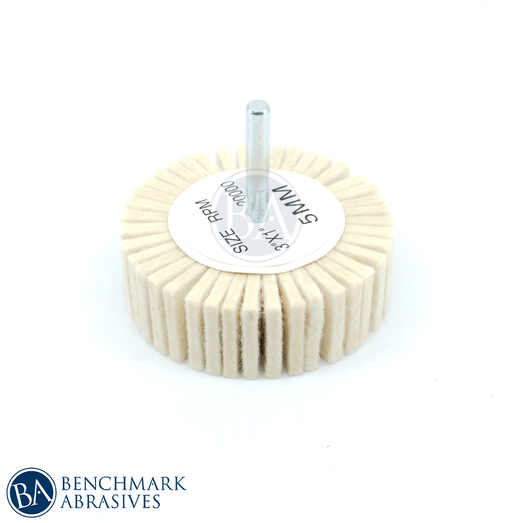 3" x 1" (1/4" shaft) Felt Flap Wheels are a very versatile buffing product made with100% Australian wool. Choose the correct buffing compound or polishing paste and they can get a perfect finish on most materials including ferrous & non-ferrous materials as well as stones, plastics, and glass.