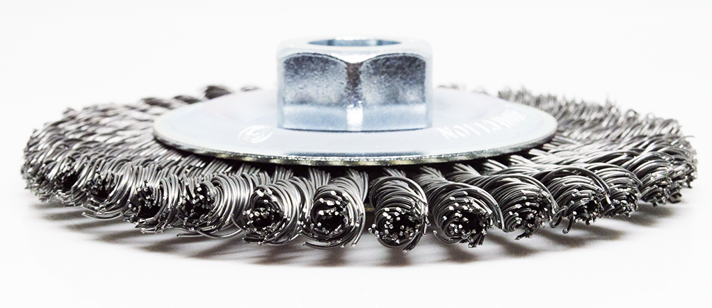 The twist knot style wires make this brush good for heavy-duty cleaning applications. It is used in surface preparation prior to welding and also great for removing weld scale, spatter, and heavy corrosion. It has 5/8"-11 threads. The standard twist knotted wire wheel is ideal for welding and metal fabrication applications. These stringer bead wire wheels are perfect for general cleaning, weld cleaning, removal of rubber flash, scale, rust, and pipeline cleaning. It can be used horizontally or vertically.
