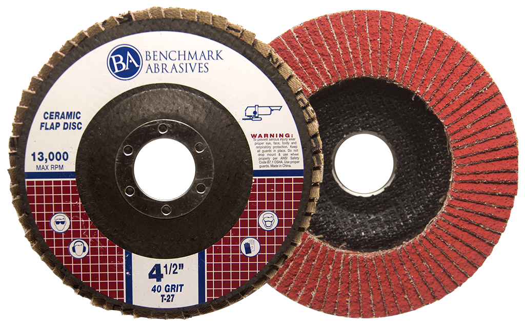 4-1/2" x 7/8" T27 (Flat Face) Ceramic Flap Discs are manufactured using European zirconia cloth. The European material is superior due to its uniform particle size and premium blend of ingredients. These flap discs are manufactured using the latest development in abrasive technology in the metalworking industry. Ceramic Flap Discs do exceptionally well, outperforming Zirconia flap discs by up to 50% on stainless steel, carbon steel allots, and exotic metals.