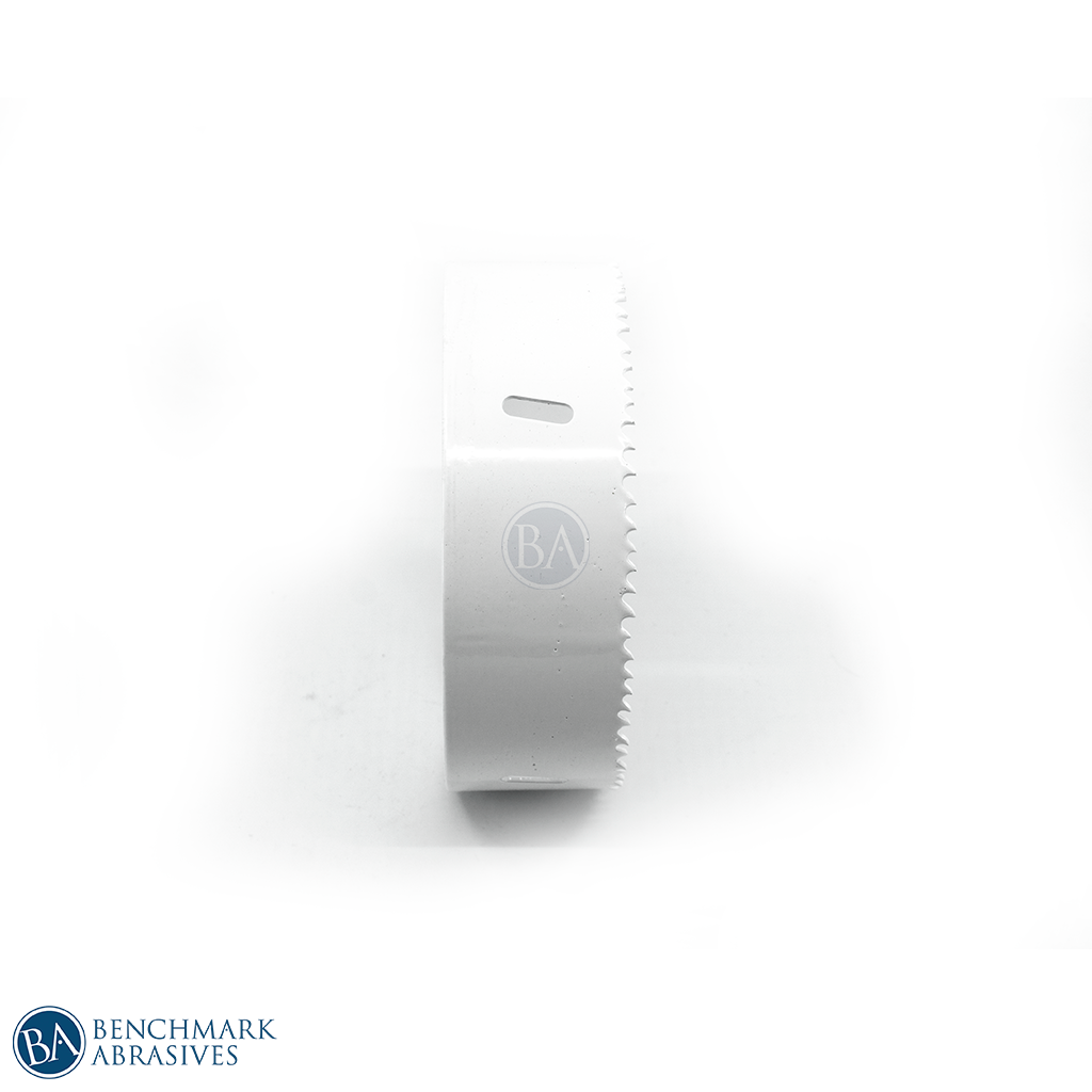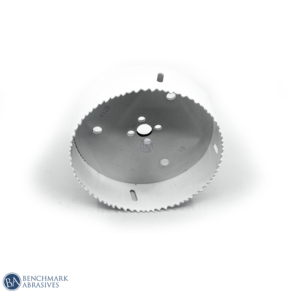 Benchmark Abrasives 5-1/4" Bi-Metal Hole saws are MADE IN USA. Constructed from durable bi-metal for high-performance cutting power, the 4/6 TPI (teeth per inch) and positive rake angle, delivers fast, clean cuts ideal for use on 2” x 4” wood board planks. Side cut outs make removal of debris and plugs a breeze.