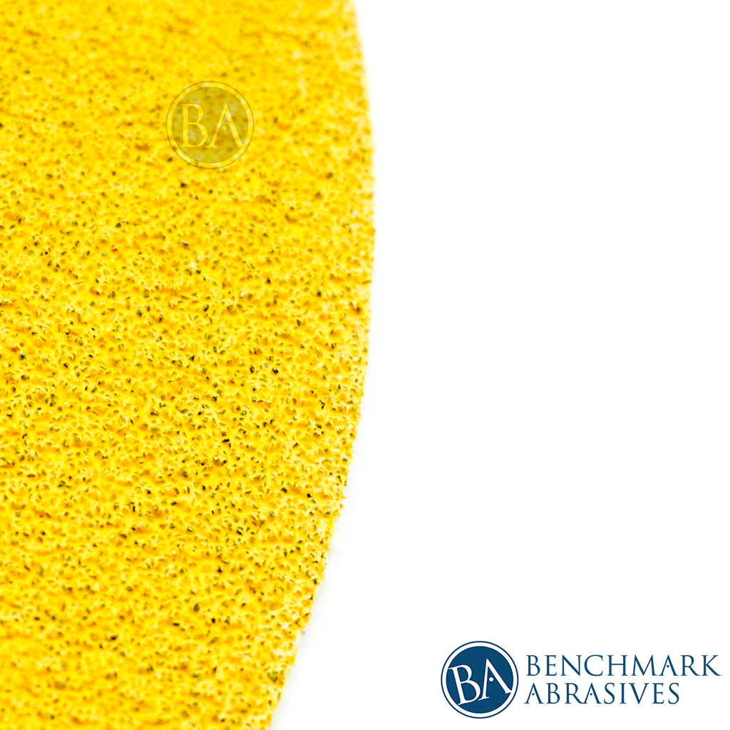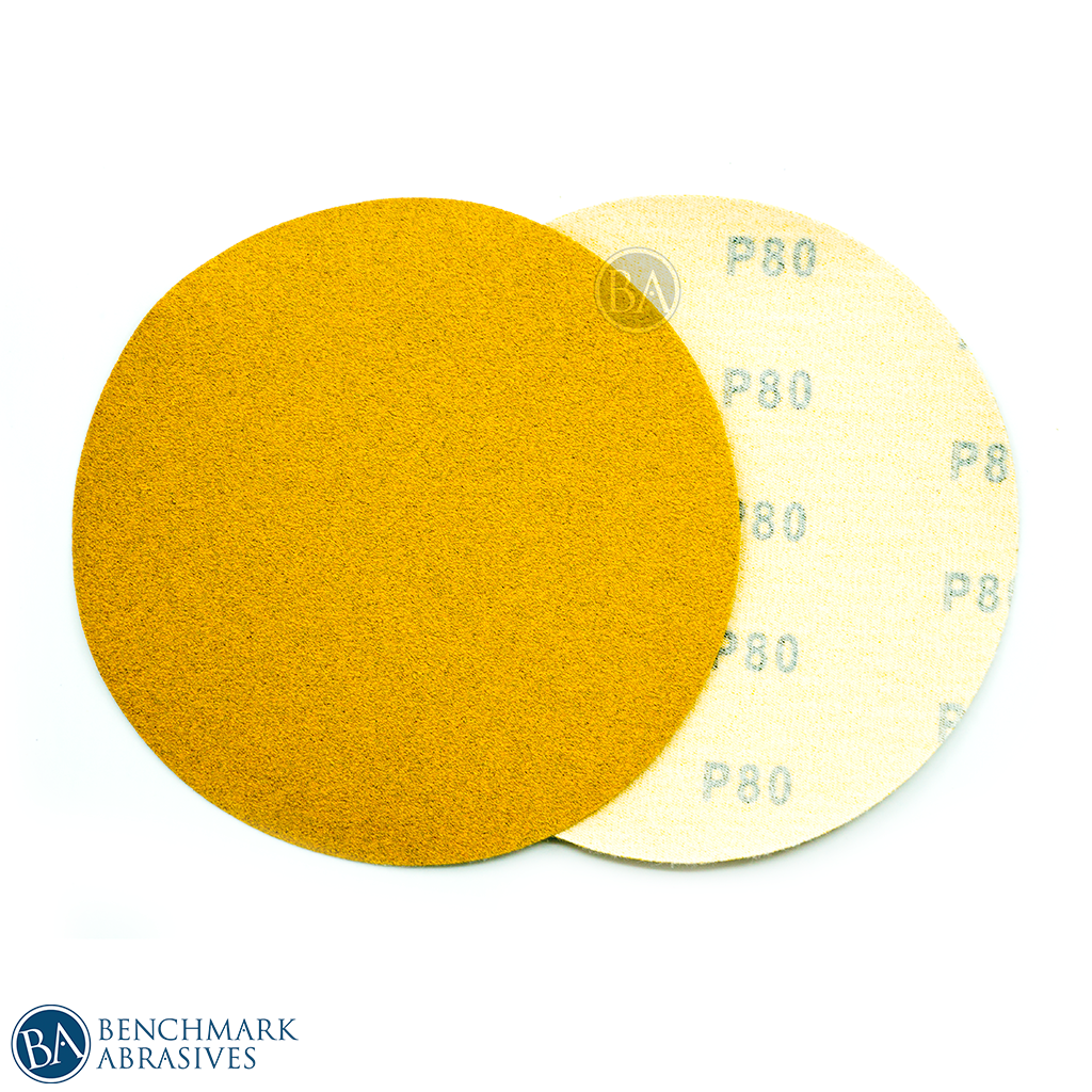 Benchmark Abrasives 6" Gold A/O No Hole Hook & Loop Discs have a backing made of a material similar to Velcro. It has the loopside of the hook and loop attach to the hook side of a backing pad. The backing pad attaches to the machine like a random orbital sander or disc sander. This makes it very simple to change the sandpaper. These discs are made with premium Gold Aluminum Oxide grains. The hook and loop sandpaper are ideal for sanding wood, metal, and plastics. This sandpaper disc features a clog-reducing net design coated in premium aluminum oxide grit for fast material removal while reducing material build-up.