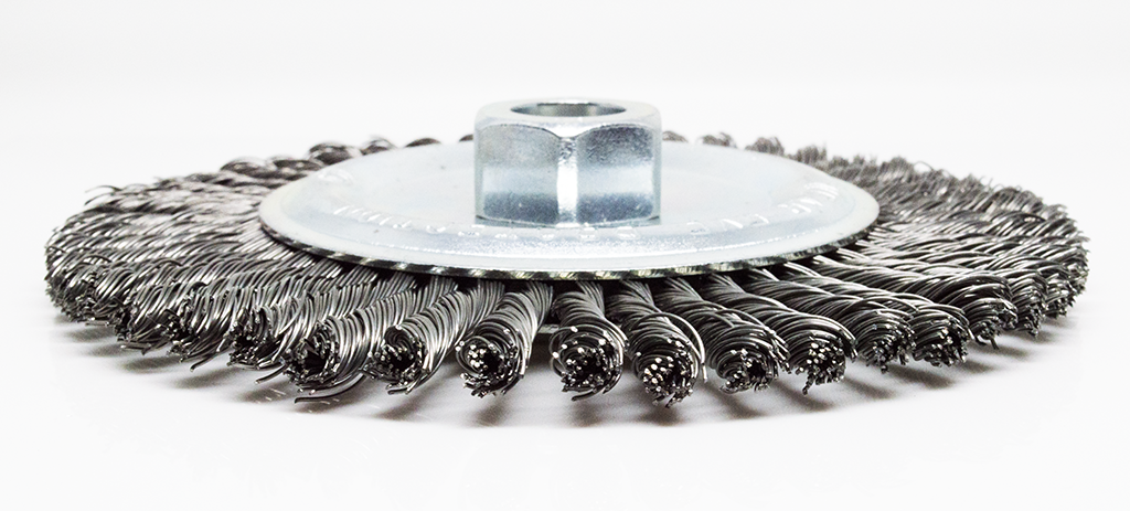 The twist knot style wires make this brush good for heavy-duty cleaning applications. It is used in surface preparation prior to welding and also great for removing weld scale, spatter, and heavy corrosion. It has 5/8"-11 threads. The standard twist knotted wire wheel is ideal for welding and metal fabrication applications. These wire wheels are perfect for general cleaning, weld cleaning, removal of rubber flash, scale, rust, and pipeline cleaning. It can be used horizontally or vertically.
