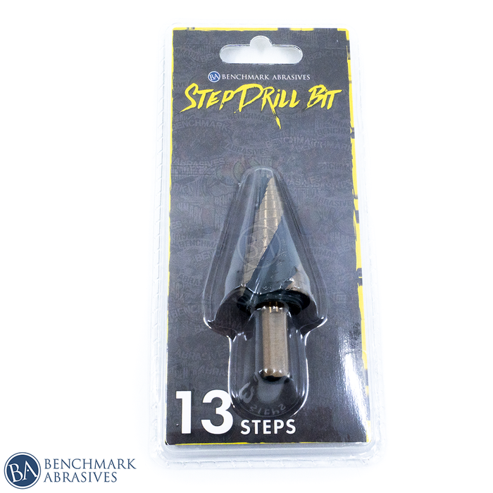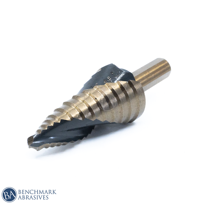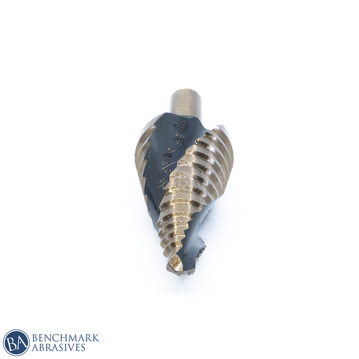Benchmark Abrasives Amber & Black Titanium Coated Step Drill Bit 9/16"-1" (13 Steps) are ideal for making burr-free holes in aluminum, wood, copper, plastic, and sheet metal. The Amber & Black coated HSS M2 Step Drill Bits are suitable for heavy maintenance work and feature a dual color step system for easier viewing, a spiral double flute design that provides longer life and better chip removal and a self-centering split point to prevent wobbling. These drill bits are optimized for Portable (or Pillar) drilling machines usage and electric powered rotary drills.
