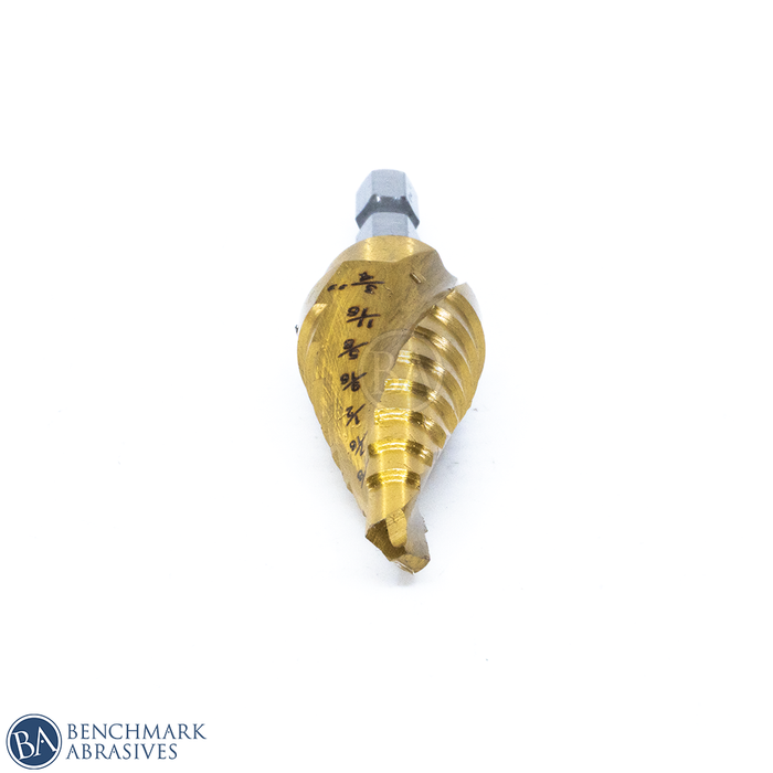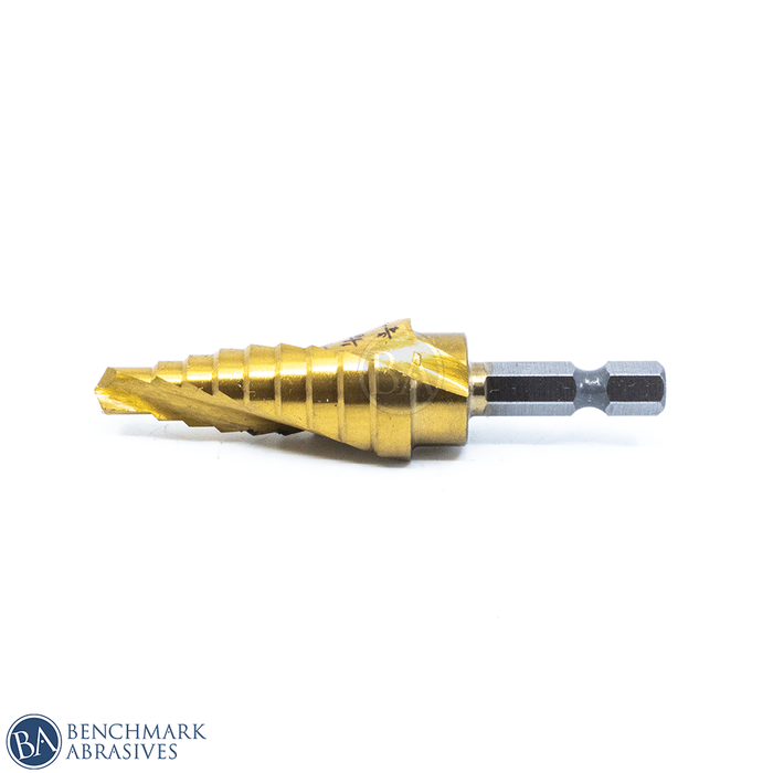 Benchmark Abrasives Economy TiN Coated Step Drill Bit 1/4"-3/4" (9 Steps) are ideal for making burr-free holes in aluminum, wood, copper, plastic, and sheet metal. The Titanium Nitride coated HSS Step Drill Bits are suitable for home light maintenance work and feature a spiral double flute design that provides longer life and better chip removal and a self-centering split point to prevent wobbling. These drill bits are optimized for impact driver usage.