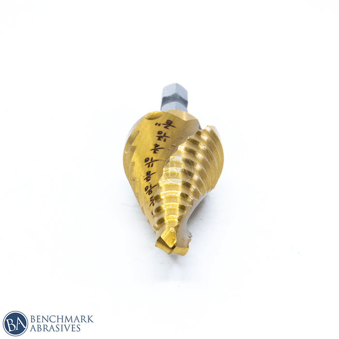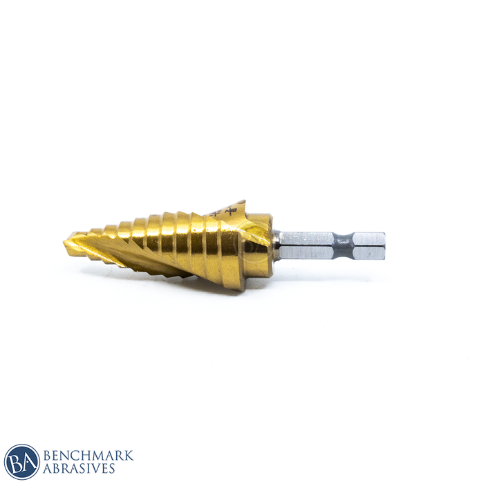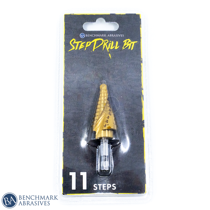 Benchmark Abrasives Economy TiN Coated Step Drill Bit 1/4"-7/8" (11 Steps) are ideal for making burr-free holes in aluminum, wood, copper, plastic, and sheet metal. The Titanium Nitride coated HSS Step Drill Bits are suitable for home light maintenance work and feature a spiral double flute design that provides longer life and better chip removal and a self-centering split point to prevent wobbling. These drill bits are optimized for impact driver usage.