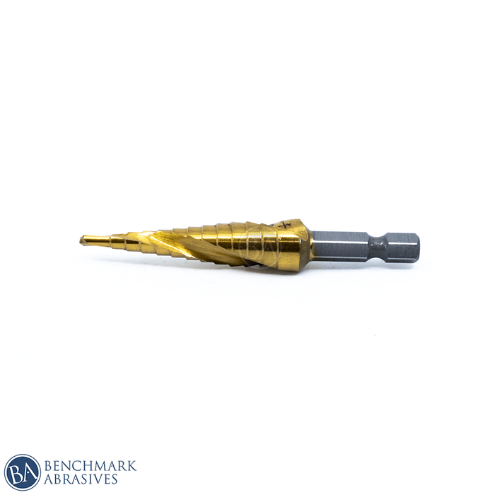 Benchmark Abrasives Economy TiN Coated Step Drill Bit 1/8"-1/2" (13 Steps) are ideal for making burr-free holes in aluminum, wood, copper, plastic, and sheet metal. The Titanium Nitride coated HSS Step Drill Bits are suitable for home light maintenance work and feature a spiral double flute design that provides longer life and better chip removal and a self-centering split point to prevent wobbling. These drill bits are optimized for impact driver usage.